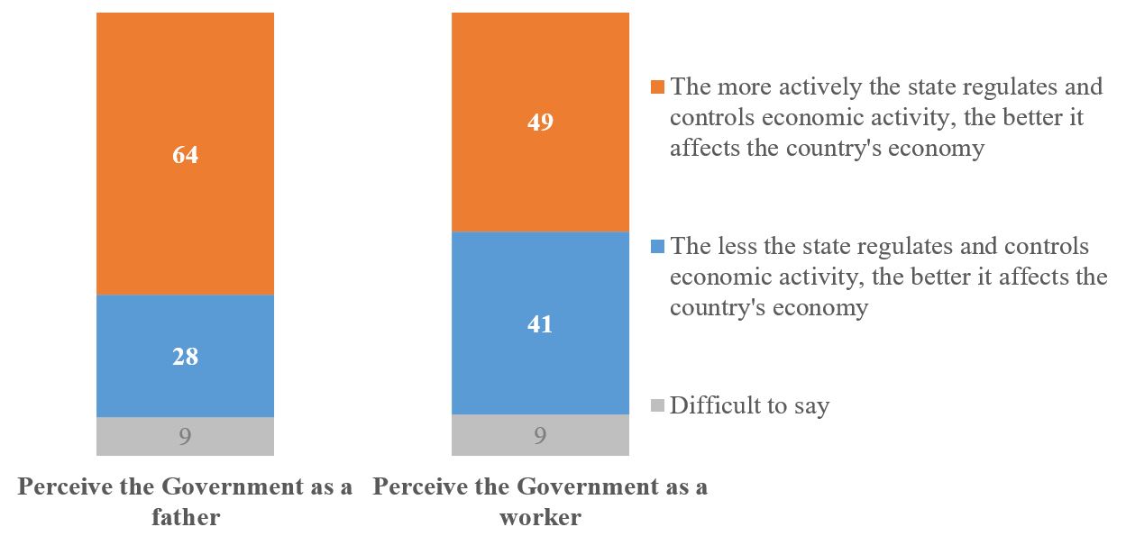 Respondents who primarily see the Government as a father are more likely to insist on its active participation and control of the economy – 64% against 28% who believe that the Government should intervene less in the economy. Along with this, and among those who see the Government as a worker, half (49%) believe that the economy would be better off if the state intervened more actively and controlled (support more freedom of action and less control - 41%).