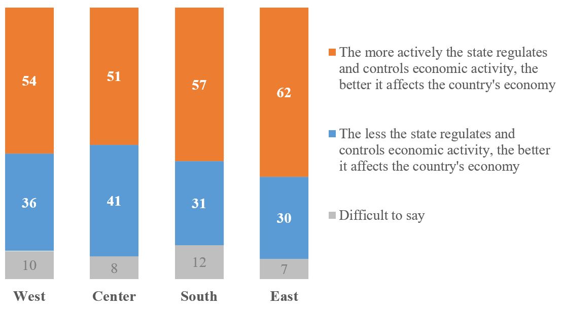 In all regions, the prevailing opinion is that the state should more actively regulate and control economic activity. This opinion is somewhat more pronounced in the South and East.