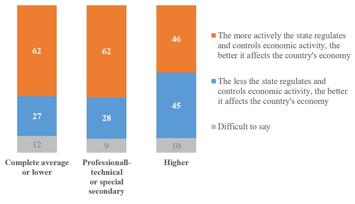 In terms of education, people with higher education stand out, among whom 45% believe that the state should regulate economic activity less. However, even among them, 46% speak about the expediency of more active participation of the state.