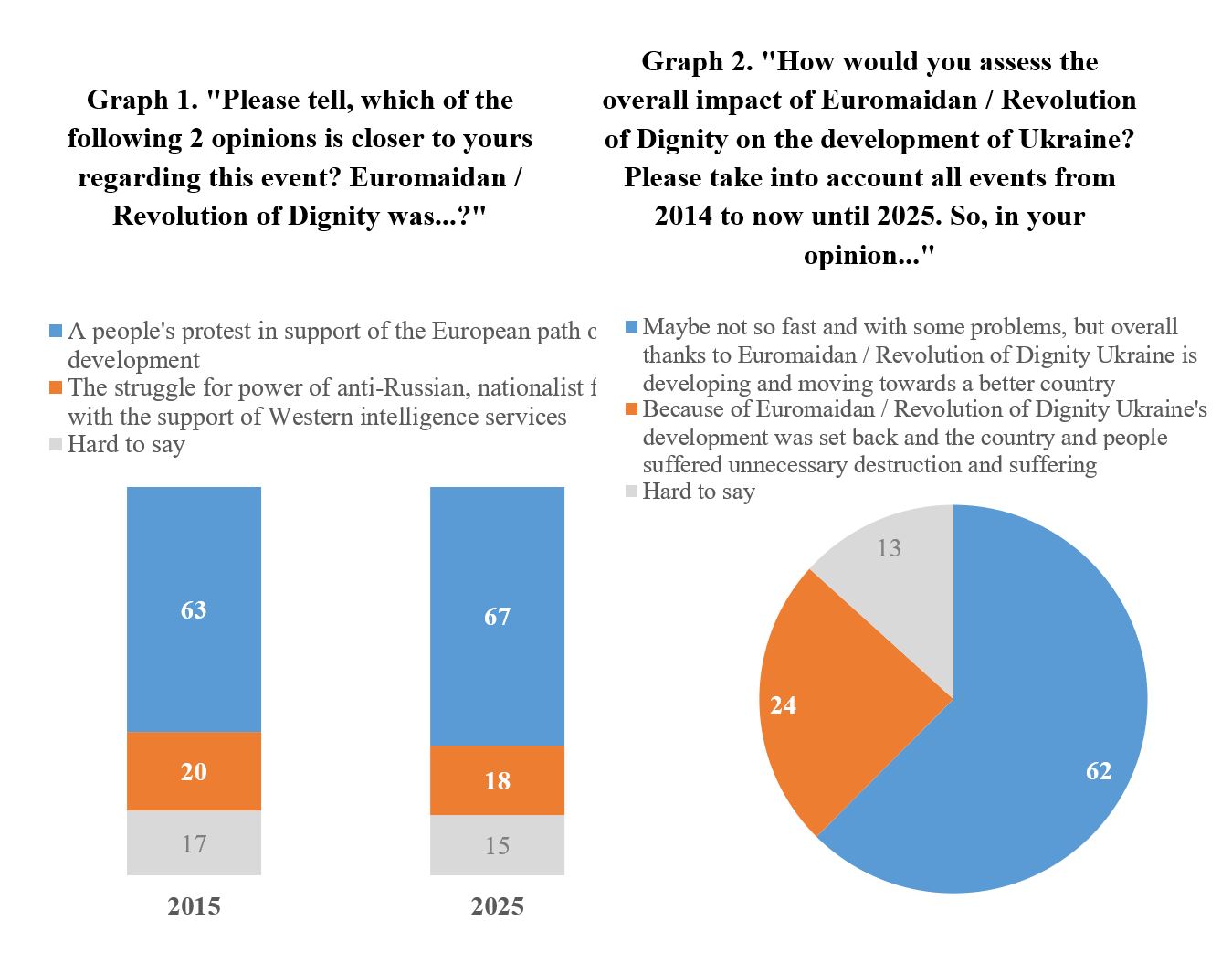 So, as can be seen in Graph 1, in 2015, 63% considered the Revolution of Dignity to be a people’s protest in support of pro-Western development, compared to 20% who were more likely to believe that it was a nationalist struggle for power with the support of Western intelligence services. Another 17% had no definite opinion. In February 2025, ten years later and after a full-scale invasion, opinions on this issue have hardly changed: now 67% consider the Revolution of Dignity a people’s protest, compared to 18% who see it more negatively. Another 15% could not decide on their view. In February 2025, we also asked how Ukrainians in general assess the impact of the Revolution of Dignity on the further development of Ukraine. 62% of respondents chose the option that, perhaps not so quickly and with certain problems, but overall, thanks to the Revolution of Dignity, Ukraine is developing and moving towards a better country. Instead, 24% share a rather negative interpretation – that because of the Revolution of Dignity, Ukraine’s development was set back, and the country and people suffered needless destruction and suffering. The remaining 13% could not decide on their views.