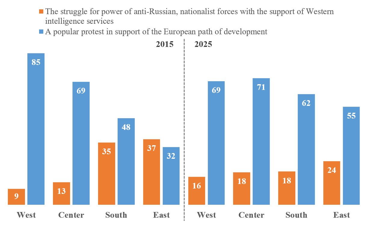 The graph below shows the regional dimension[2] of perception of the Revolution of Dignity. It was shown above that at the national level, the perception of the Revolution of Dignity has not changed significantly. However, there is a more important dynamic – a significant reduction in regional differences. Thus, in 2015, the share of those who perceived the Revolution of Dignity as a people’s protest decreased from 85% to 32% from West to East. However, in 2025, the majority in all regions (69% in the West, 71% in the Center, 62% in the South and 55% in the East) perceive the Revolution of Dignity as a people’s protest. Thus, although some regional differences persist, as of 2025 they are not very significant and we can speak of a certain interregional consensus.