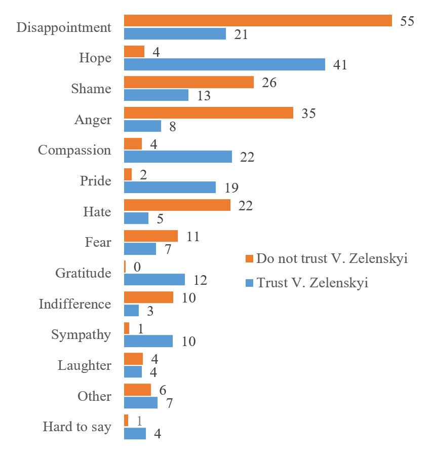 The graph below shows the data in terms of whether respondents trust V. Zelenskyi or not. Among those who do not trust V. Zelenskyi, critical/negative emotions clearly prevail (in particular, 55% speak of disappointment, and 35% even anger). At the same time, among those who trust V. Zelenskyi, the spectrum of feelings/emotions, although biased towards positive ones, is quite diverse (for example, on the one hand, 41% speak of hope, 22% of sympathy, 19% of pride, but every fifth (21%) speaks of disappointment). That is, some Ukrainians have a differentiated attitude towards the “current government of Ukraine” and “President V. Zelenskyi”.