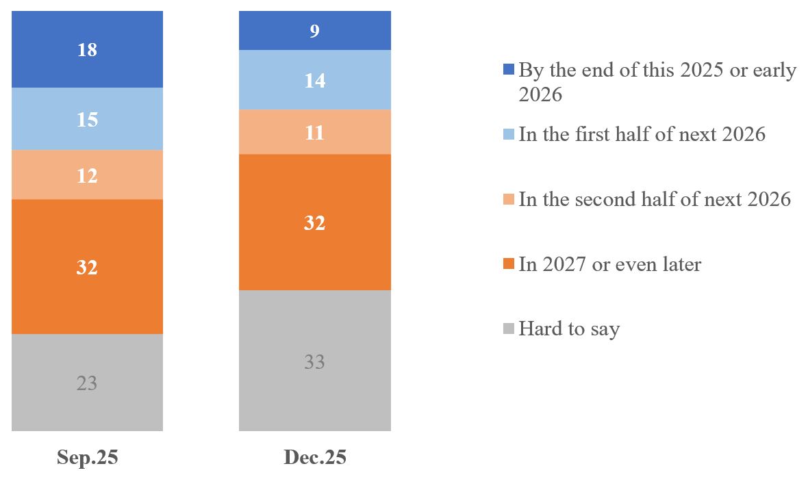 Only 9% of Ukrainians expect the war to end by early 2026 (down from 18% in September) and only 14% expect it to end at least in the first half of 2026 (down from 15% in September). That is, only a quarter of Ukrainians expect it to end in the relatively near future. Instead, 11% say about the second half of 2026 (was 12%), 32% say about 2027 and later (was the same number). Every third respondent (33%, an increase from 23% compared to September)) answered "don't know".