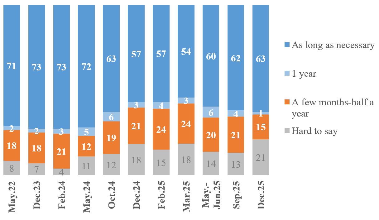 At the same time the majority of Ukrainians (63%) continue to say that they are ready to endure the war as long as necessary (in September it was 62%). Another 1% said they were ready to endure for about a year. 15% of respondents say a shorter period (six months or several months) (in September it was 21%, but at the same time, the number of those who could not answer the question increased from 13% to 21%).