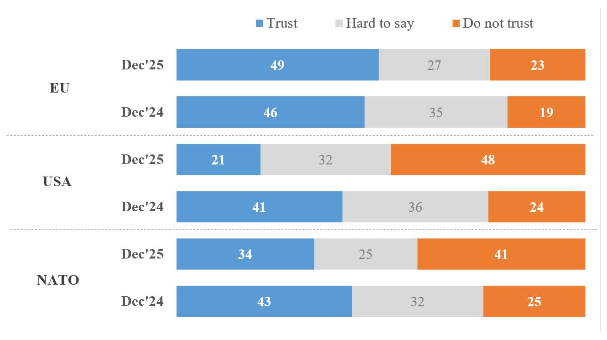 The graph below shows the dynamics of trust in the EU, the USA and NATO. We would like to separately note a methodological specific that must be taken into account when interpreting the results: we read out to respondents all the answer options, including the option “hard to say for sure”. So, 49% trust the EU, 23% do not trust it (in December 2024 it was 46% and 19%, i.e. almost unchanged). The remaining 27% answered “hard to say for sure.” Overall, it can be seen that the EU is more likely to enjoy the trust of Ukrainians. At the same time, the indicators of trust in the USA and NATO are significantly lower, which also demonstrate a significant downward trend over the year. Thus, the USA is trusted by 21% (down from 41% in December 2024), and distrusted by 48% (up from 24% in December 2024). The remaining 32% could not decide on their opinion. (At the same time, let's recall our results for May 2025: if to ask about ordinary Americans, then 90% of Ukrainians have a good attitude towards them[3]) In the case of NATO, 34% trust the organization (down from 43% in December 2024), while 41% do not trust it (up from 25%). The remaining 25% could not decide.