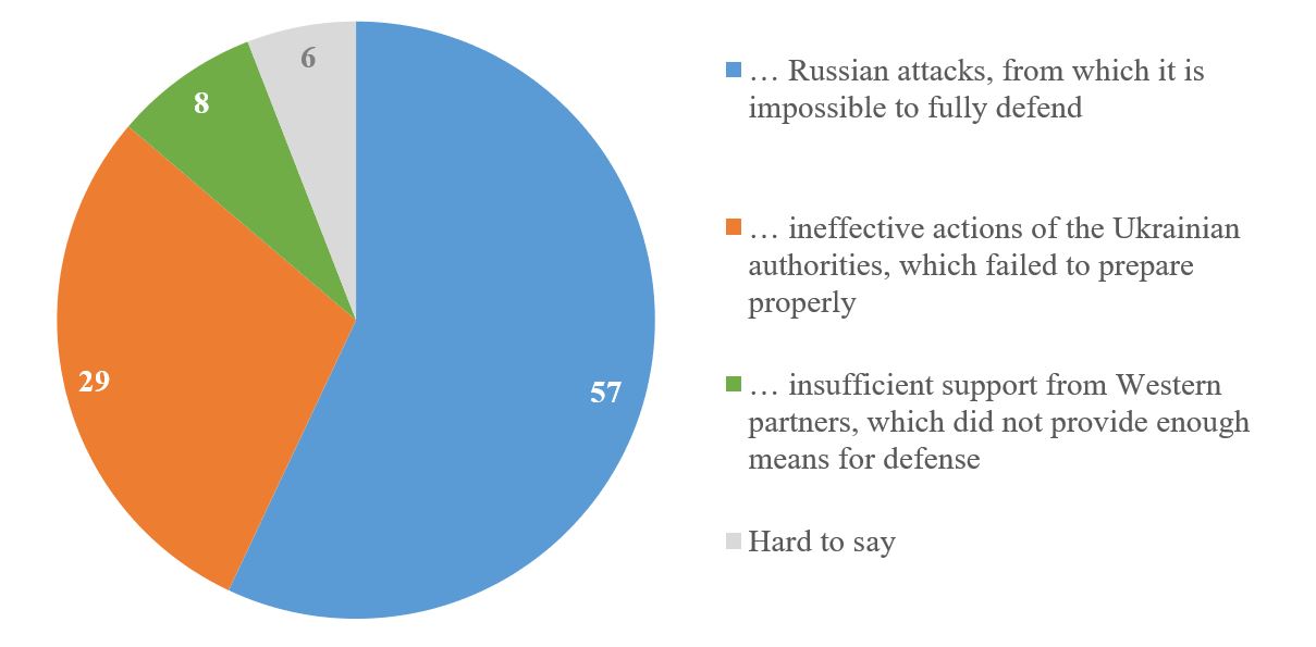 The Russian enemy also continues the information war against Ukrainians, and this can be seen in particular in the situation of the lack of electricity due to Russian shelling. We can see the spread of narratives that shift the focus and responsibility from the Russians themselves to, for example, Ukraine itself (in the form of criticism of the Ukrainian authorities) or to Western partners. Therefore, we asked a question about what is the main reason for the lack of electricity, and offered three answer options (the respondent had to choose only one answer). So, the majority of Ukrainians – 57% – say that the main reason is Russian shelling, from which it is impossible to fully defend. At the same time, 29% place the responsibility primarily on the Ukrainian authorities, which, in their opinion, were not adequately prepared. Another 8% believe that the main reason is insufficient support from Western partners.