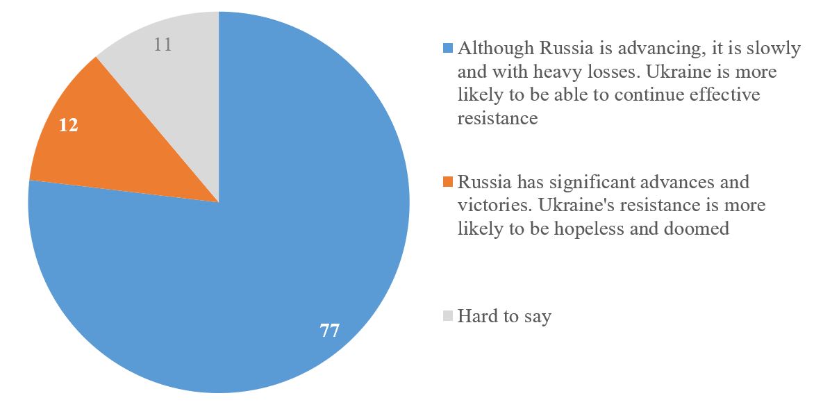 To assess the situation at the front, respondents were asked to choose one of the statements with a more optimistic or more pessimistic interpretation. The absolute majority of respondents – 77% – share the view that although Russia is advancing, it is slowly and with heavy losses, and Ukraine is able to continue effective resistance. Share a more pessimistic view, according to which Russia has made significant advances and victories, and Ukraine's resistance is hopeless – 12%. Another 11% could not decide on their opinion.