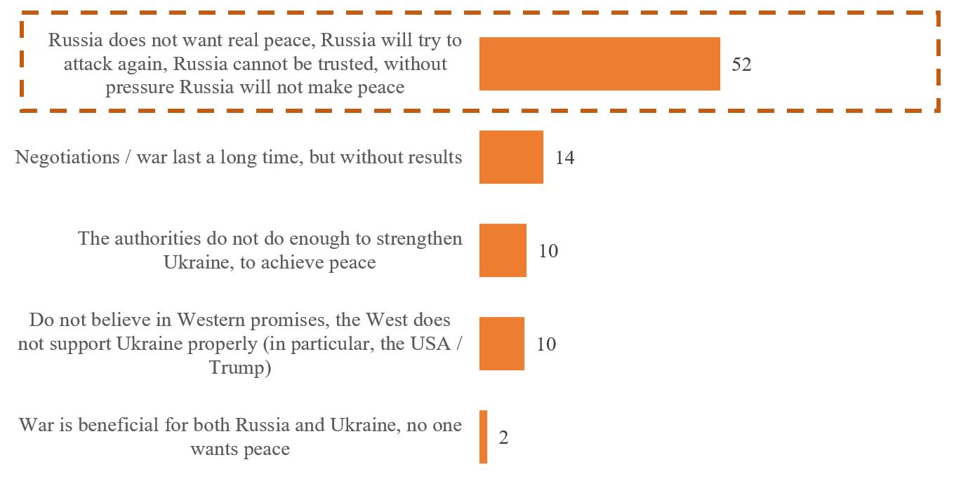 Respondents who answered they did not believe that negotiations would lead to peace (or were undecided) were asked an additional question – we asked them to answer in an open-ended manner why they think so. Most of these respondents (52%) explain their lack of faith in the success of the negotiations by saying that Russia does not want real peace, that Russia plans to continue the war, etc. For example, direct speech from several respondents: “Russia’s goal is to destroy Ukraine, they won’t calm down.” “Putin doesn’t need it. Until Russia collapses, there will be war. Even if they come to an agreement, peace will be temporary.” “As long as the Russians have resources left, they will move forward.” “Because agreements with Russia, as the classic said, are not worth the paper they are written on.” “Because verbal arguments do not force Russia to act.”