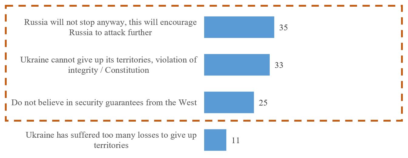 Respondents for whom such a condition is categorically unacceptable (or who hesitated to answer) were asked an additional open-ended question as to why they thought so. So, there are three roughly equally common explanations for why Ukrainians reject such a condition (% among those who believe that such a condition is categorically unacceptable or who found it difficult to answer):