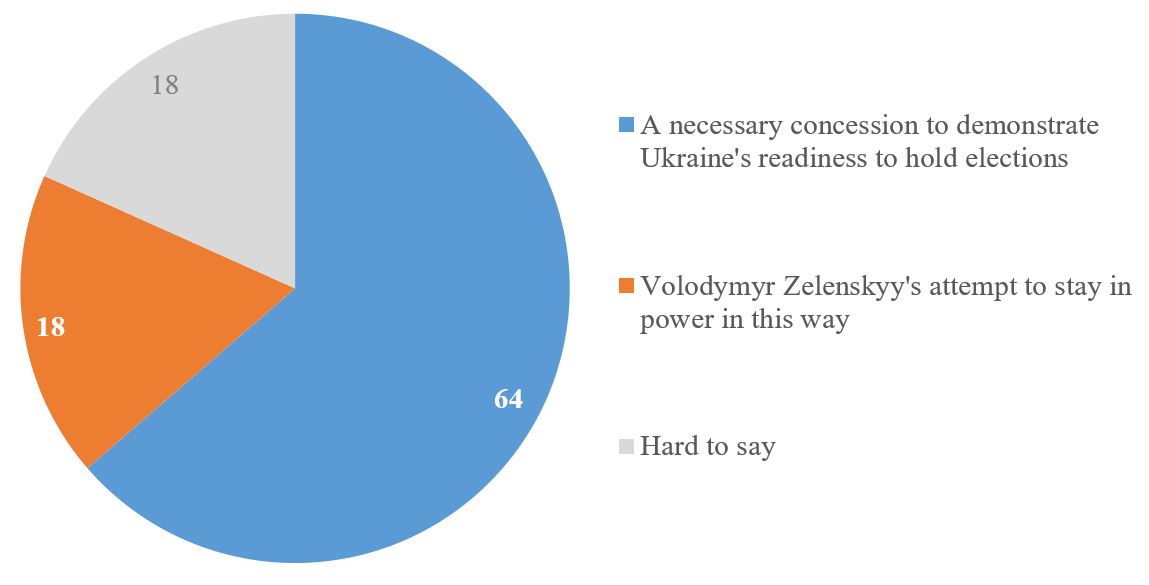 Most respondents (64%) believe that the idea of holding presidential elections 2-3 months after the ceasefire is a necessary concession to demonstrate Ukraine's readiness to hold the voting. Believe that this is an attempt by V. Zelenskyy to stay in power in this way – 18% (and another 18% are undecided).
