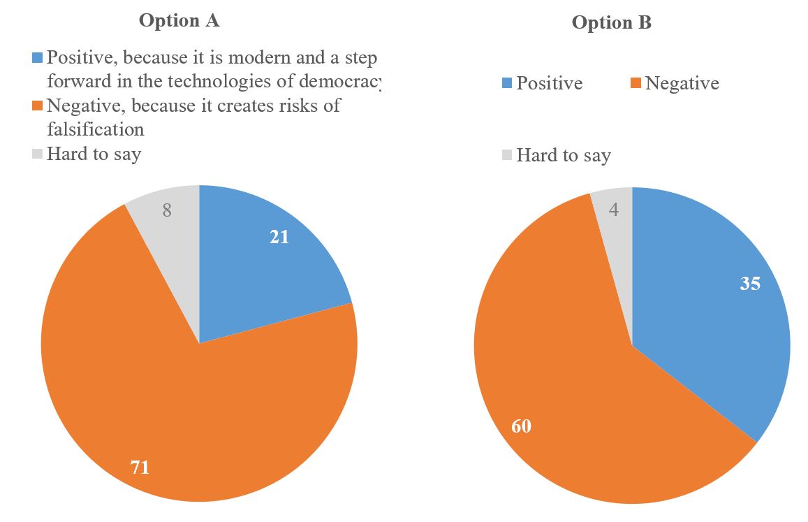 KIIS has asked questions about online voting several times, offering to choose between two statements (option A below)[1]. These statements reflected the realities of the period before the full-scale invasion, although the context of the discussion is somewhat different now. Therefore, to continue the dynamics, we asked half of the respondents the same question (option A), and the other half – in a different wording, where we simply asked whether they had a positive / negative attitude towards online voting (option B). As can be seen, if to just ask (without additional information), 60% are negative about the idea of online voting and only 35% are positive. If to give additional explanations, then 71% choose the option with a critical attitude towards online voting, as it creates risks of falsifications. And instead, only 21% choose the option that this is a step forward in the technologies of democracy. Moreover, in 2023, when asked a similar question, 69% answered that they had a negative attitude due to the risk of falsifications (versus 29% who had a positive attitude). That is, no significant changes have occurred over the past few years. Thus, in any case, online voting is perceived unfavorably by the population, and in the event of a discussion of possible falsifications, the attitude deteriorates even further.