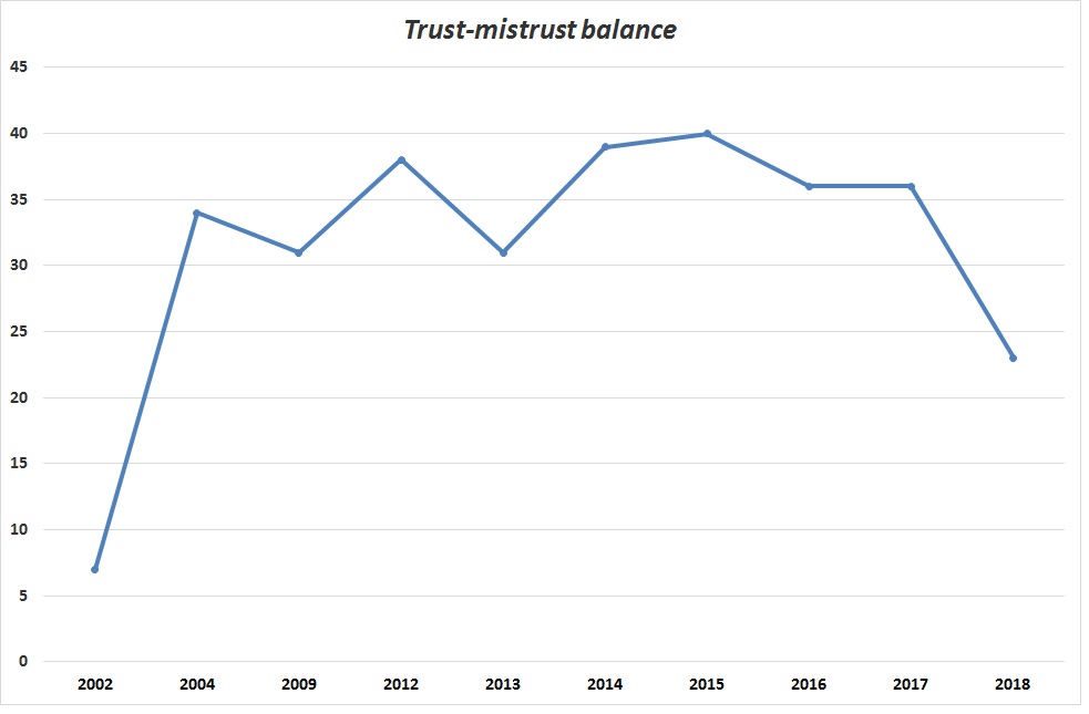 Graph 1. Trust-mistrust balance to sociological centers (percentage of those who trust minus the percentage of those who do not) from 2002 to 2018 ![]()