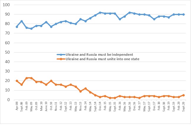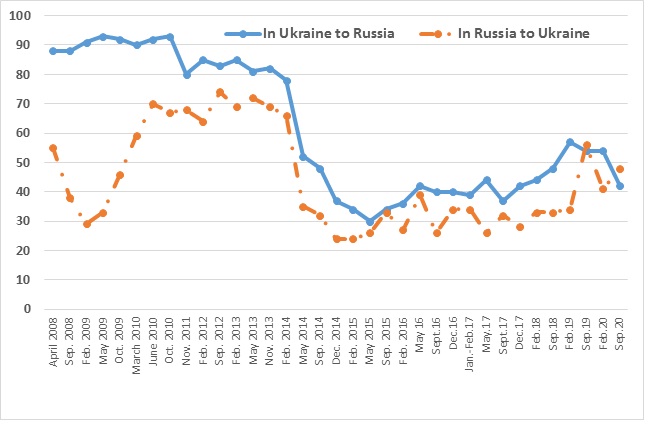 During the entire observation period (except September 2019), Ukrainians treated Russia better than Russians treated Ukraine (see Graph 1). In September 2019, Russians 'attitude toward Ukraine was somewhat better, possibly due to the expectation that the new Ukrainian government would change Ukrainians' attitude toward Russia. After the annexation of Crimea and the start of military actions in Donbass, there was a sharp decline in the positive attitude of Ukrainians to Russia (from 90% to 30%), but after the end of active hostilities, the attitude of Ukrainians to Russia again improved somewhat. And now, in August-September 2020, Ukrainians 'attitude toward Russia has deteriorated again, and Russians' attitude toward Ukraine has improved somewhat, and for the second time in the history of observations, Russians treat Ukraine better than Ukrainians treat Russia (but the difference is minimal). However, this time the surveys are not completely equivalent, because in Russia the research was conducted by face-to-face interview, and in Ukraine - by telephone survey, this issue needs further study.