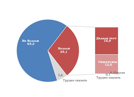 Пресс-релиз подготовлен PR-менеджером КМИС Татьяной Пясковской В течение 13-15 апреля 2021 года Киевский международный институт социологии (КМИС) провел всеукраинский опрос общественного мнения. Методом телефонных интервью с использованием компьютера (computer-assisted telephone interviews, CATI) на основе случайной выборки мобильных телефонных номеров опрошено 2001 респондентов, проживающих во всех регионах Украины (кроме АР Крым). Выборка репрезентативна для взрослого населения (в возрасте 18 лет и старше) Украины. В выборку не включаются территории, которые временно не контролируются властью Украины - АР Крым, отдельные районы Донецкой и Луганской областей. В Луганской и Донецкой областях опрос проводился только на территории, контролируемой украинскими властями. Статистическая ошибка выборки (с вероятностью 0,95 и с учетом дизайн-эффекта 1,1) не превышает 2,4% . На вопрос «Переболели ли Вы уже или сейчас болеете COVID 19? / Почему Вы считаете, что это именно COVID 19 - делали тесты или только по симптомам?», 65% опрошенных ответили, что не болели, 29% - что болели. Из тех, кто болел 17% делали тест, 12% - испытывали симптомы. График 1. Переболели ли Вы уже или сейчас болеете COVID 19? / Почему Вы считаете, что это именно COVID 19 - делали тесты или только по симптома![]()