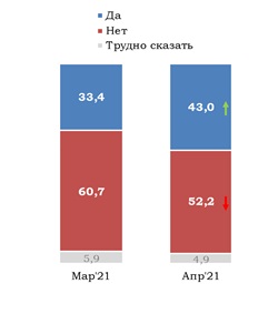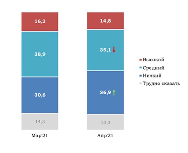 График 5. Готовы ли Вы делать прививку в ближайшие несколько месяцев? Распределение по возрасту, % ![]() График 6. По Вашим оценкам, как в последнее время меняется уровень заболеваемости коронавирусом в Украине? ![]() На вопрос «Как Вы оцениваете риск инфицирования COVID 19 в Вашей семье в течение следующих 6 месяцев?», 37% ответили, что риск низкий (в марте так считали 31%), 35% - средний (в марте - 39%), 15% - что риск высокий (было 16%, разница не является значимой).
