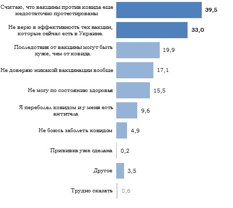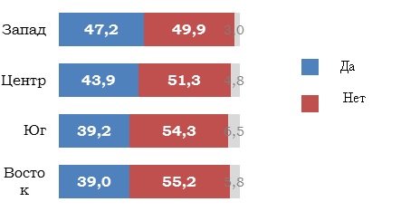 График 4. Готовы ли Вы делать прививку в ближайшие несколько месяцев? Распределение по регионам Украины, % ![]() [1] Запад - Волынская, Закарпатская, Ивано-Франковская, Львовская, Ровенская, Тернопольская, Хмельницкая и Черновицкая области, Центр - Винницкая, Житомирская, Кировоградская, Киевская, Полтавская, Сумская, Черниговская области и г. Киев, Юг - Днепропетровская, Запорожская, Николаевская, Одесская и Херсонская области, Восток - Донецкая, Луганская и Харьковская области.