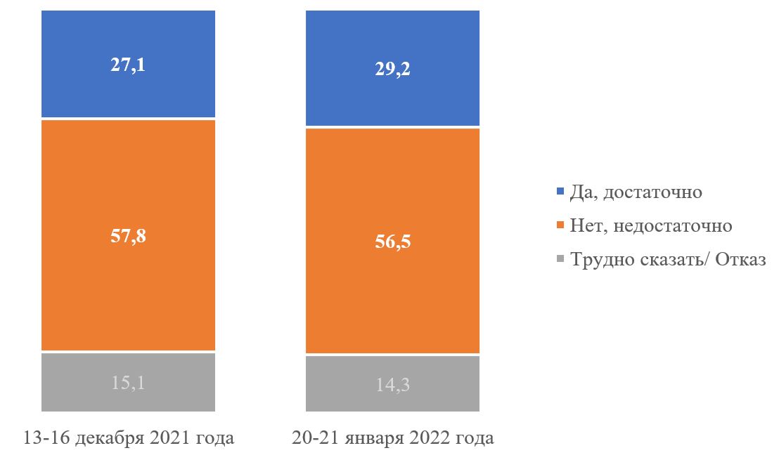 Большинство респондентов – 56,5% – считают недостаточными дипломатические и оборонные усилия власти по предотвращению вторжения России. Считают усилия достаточными – 29,2%. По сравнению с серединой декабря 2021 года ситуация практически не изменилась.