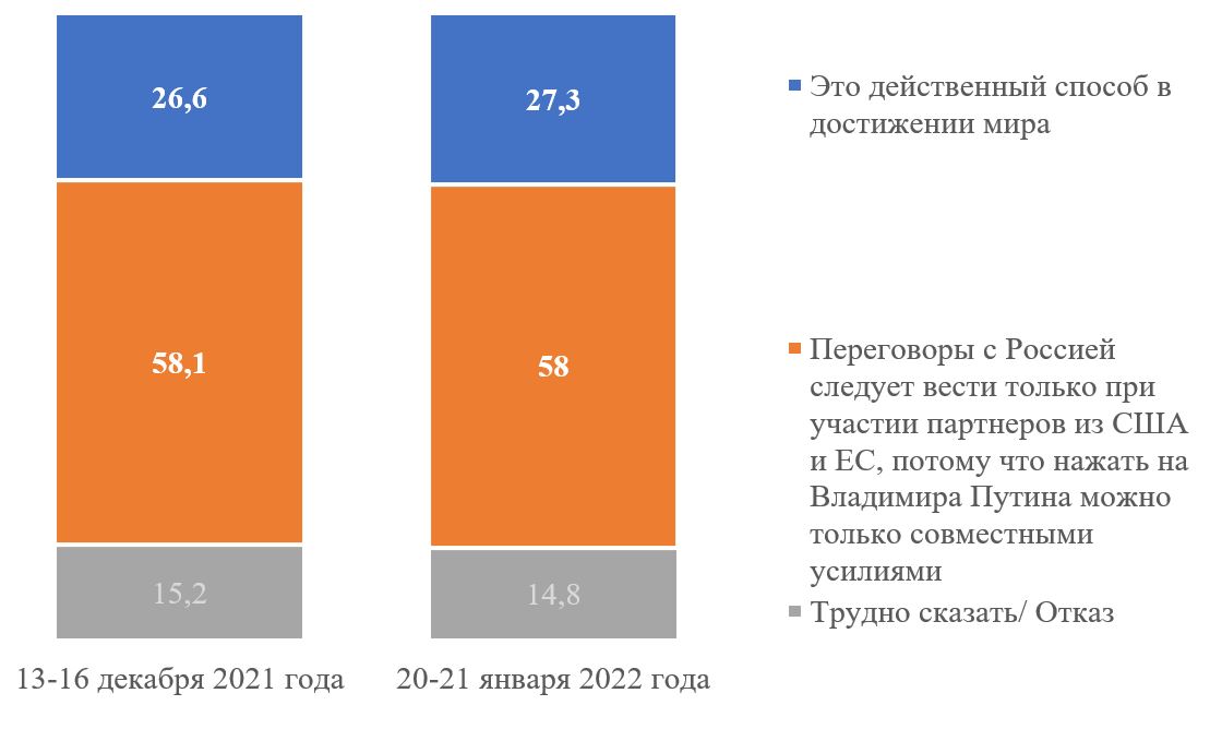 Большинство респондентов – 58% – считают, что переговоры с В. Путиным следует вести только при участии западных партнеров. Считают прямые переговоры В. Зеленского и В. Путина действенным способом достижения мира - 27,3% респондентов. Ситуация не изменилась по сравнению с декабрем 2021 года.