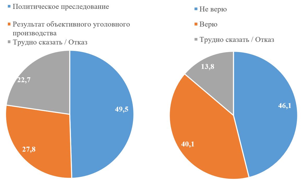 При этом, 49,5% респондентов считают дело политическим преследование против 27,8%, которые считают результатом объективного уголовного производства. Кроме того, 46,1% не верят в правдивость таких обвинений, в то время как верят – 40,1%.
