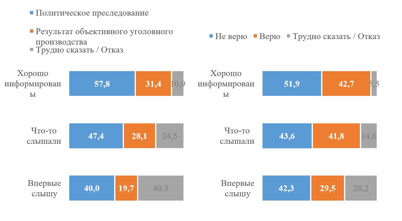 Чем более информированы респонденты о деле, тем больше среди них, кто считает дело политическим преследованием и не верят в правдивость обвинений. Так, среди хорошо информированных респондентов 57,8% считают дело политическим преследованием и 51,9% не верят в правдивость обвинений.