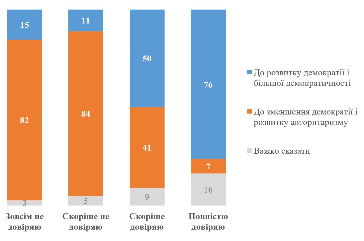 На графіку нижче наведені дані, чи як оцінюють напрямок розвитку країни ті, хто не довіряє / довіряє Президенту В. Зеленському. Як можна бачити, має місце дуже тісний зв’язок. Серед тих, хто не довіряє Президенту, абсолютна більшість (82% у випадку тих, хто зовсім не довіряє, і 84% у випадку тих, хто скоріше не довіряє) вважають, що країна рухається до авторитаризму. Водночас ті, хто довіряють Президенту, більш оптимістично дивляться на розвиток ситуації, проте серед них є диференціація. Так, серед тих, хто повністю довіряє Президенту, 76% говорять про рух до більшої демократичності і лише 7% бачать розвиток авторитаризму. Водночас серед тих, хто скоріше довіряє Президенту, уже 50% бачать рух до демократії, а частка тих, хто бачить рух до авторитаризму сягає 41%.