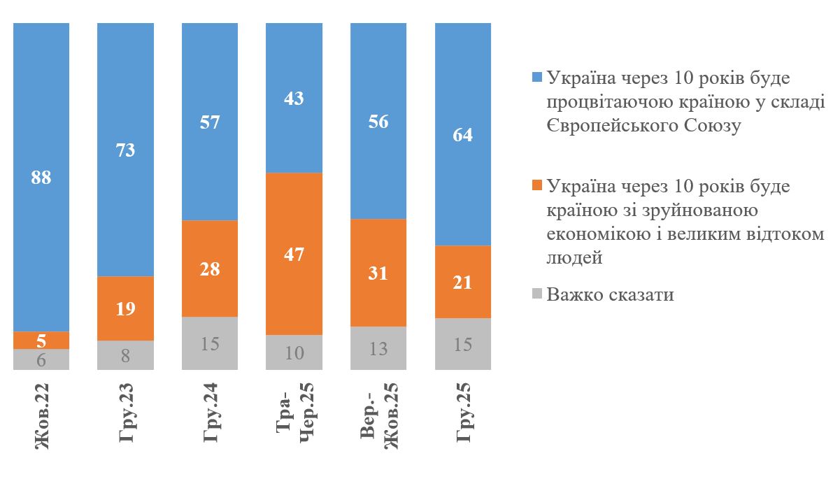 Як можна бачити на графіку нижче, з жовтня 2022 року і до травня 2025 року була стабільна тенденція до зниження оптимізму в українському суспільстві і в травні 2025 року ми вперше зафіксували переважання песимістичних настроїв. Так, у травні 2025 року 47% вважали, що через 10 років Україна буде країною із зруйнованою економікою і великим відтоком населення – проти 43%, які вважали, що через 10 років Україна буде процвітаючим членом ЄС. Утім, далі, у другій половині 2025 року, ми спостерігаємо відновлення оптимістичних настроїв – частка оптимістів спочатку зросла до 56% на початку жовтня і далі до 64% у грудні. Натомість з 47% у травні до 21% у грудні стало менше тих, хто вважає, що через 10 років Україна буде зруйнованою країною із значним відтоком населення. Показники оптимізму на кінець 2025 року навіть трохи перевершили показники на кінець 2024 року, хоча й лишаються нижчими, ніж були в 2022-2023 роках.