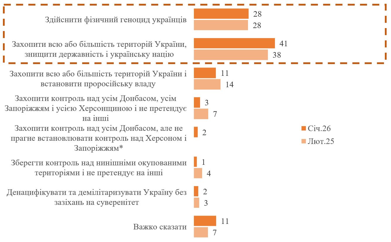 Переважна більшість українців – 69% – продовжують сприймати війну як екзистенційну загрозу і вважають, що Росія або хоче здійснити фізичний геноцид, або знищити українську націю і державність (у лютому 2025 року було майже стільки ж – 66%). Ще 11% вважають, що Росія хоче захопити більшість територій України і встановити маріонеткову владу (раніше було 14%). Вважають, що Росія хоче «обмежитися» лише 5 регіонами в повних межах (тобто включно із Донеччиною, Запоріжжям і Херсонщиною, яку зараз контролює Україна) – 3%. Тобто загалом 83% респондентів вважають, що поточна мета Росії виходить за межі Донбасу (і переважно мова про повне підкорення / знищення України). Схиляються до думки, що Росія наразі прагне лише окупувати весь Донбас, без контролю над Запоріжжям і Херсонщиною (тобто те, що є нібито предметом перемовин) – лише 2%. І лише 1% вважають, що Росія «обмежитися» лише зараз окупованими територіями. При цьому є 2% респондентів (майже стільки ж було раніше), які вважають, що Росія просто хоче «денацифікувати» та «демілітаризувати» Україну без зазіхань на суверенітет.