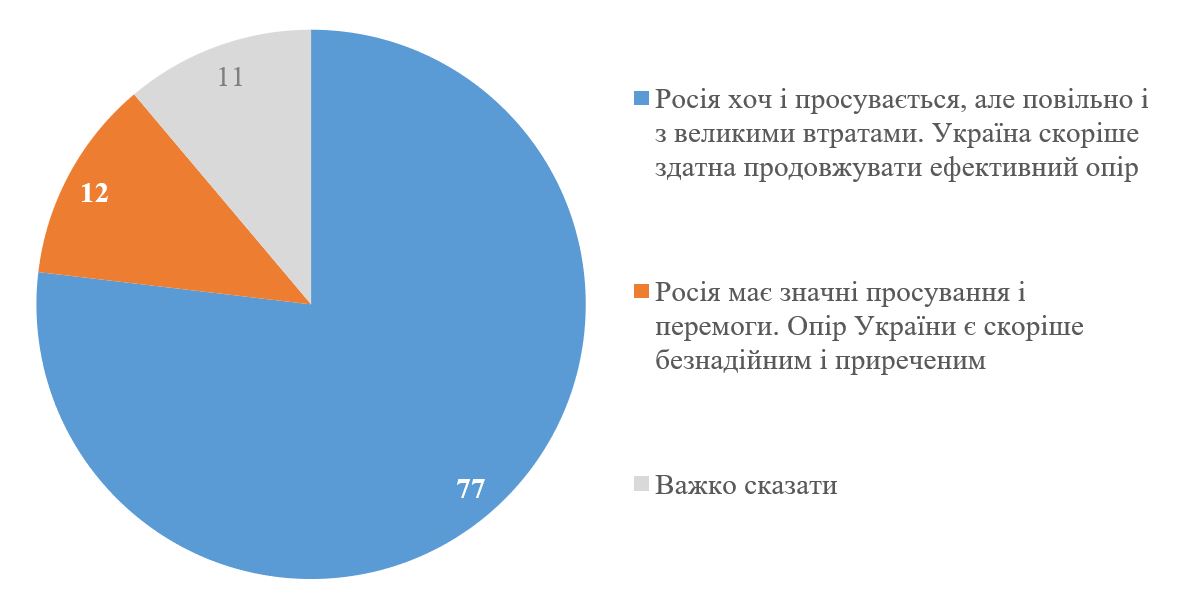 Для оцінки ситуації на фронті респондентів просили обрати одне з тверджень з більш оптимістичним чи більш песимістичним трактуванням. Абсолютна більшість респондентів – 77% – поділяють погляд, що Росія хоч і просувається, але повільно і з великими втратами, а Україна здатна продовжувати ефективний опір. Поділяють більш песимістичний погляд, згідно з яким Росія має значні просування і перемоги, а опір України безнадійний – 12%. Ще 11% не змогли визначитися із своєю думкою.