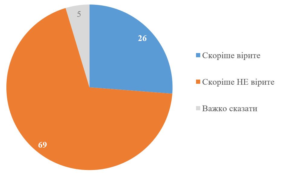 Переважна більшість респондентів – 69% – не вірять, що нинішні перемовини приведуть до сталого миру в Україні. Вірять в успіх перемовин – 26%. Ще 5% не змогли визначитися із своєю думкою.