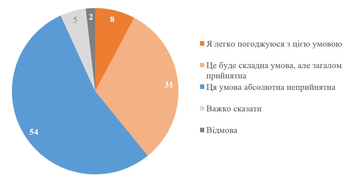 Зараз я зачитаю можливу умову для досягнення миру, а ви скажіть мені, наскільки вона для вас прийнятна. Використовуйте шкалу «Я легко погоджуюся з цією умовою», «Це буде складна умова, але загалом прийнятна», «Ця умова абсолютна неприйнятна».