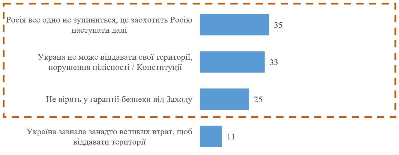 Респондентам, для яких така умова є категорично неприйнятною (або які засумнівалися з відповіддю), ставилося додаткове запитання у відкритій формі, чому вони так вважають. Отже, є три приблизно однаково поширені пояснення, чому українці відкидають таку умову (% серед тих, для кого умова є категорично неприйнятною або кому було важко відповісти):