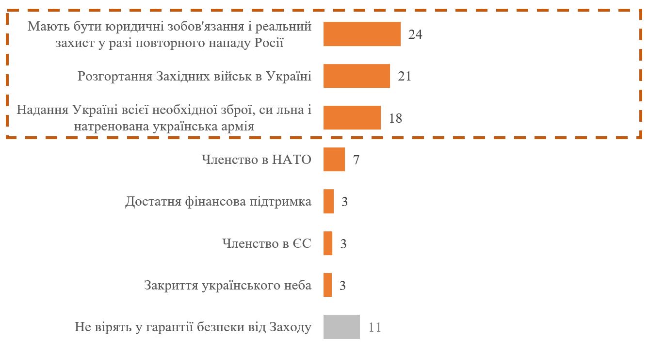 Графік 7. А які саме гарантії безпеки від США і Європи ви будете вважати достатніми, щоб вірити ним? Відкрите запитання, топ-відповіді, % серед тих, хто може погодитися на таку умову