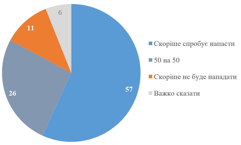 Більшість українців – 57% – навіть у разі «заморожування» війни за нинішньою лінією фронту і отримання гарантій безпеки очікують, що Росія спробує знову напасти. Ще 26% оцінюють імовірність як 50 на 50 (що також відображає доволі суттєві побоювання повторного нападу). Лише 11% українців вважають, що Росія не буде знову нападати.