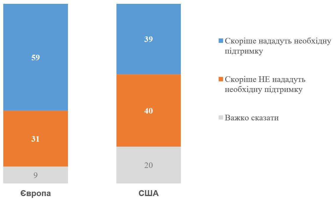 Якщо ж Росія за таких умов нападе, то 59% очікують, що Європа все-таки надасть усю необхідну підтримку для відбиття нападу (вважають, що не надасть – 31%). Щодо США простежуються значні сумніви і лише 39% очікують, що США нададуть всю необхідну підтримку. Вважають, що США не нададуть підтримку – 40%, а ще 20% не змогли визначитися із своєю думкою.
