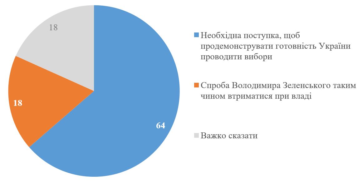 Більшість респондентів (64%) вважають, що ідея провести вибори Президента через 2-3 місяці після перемир’я – це необхідна поступка, щоб продемонструвати готовність України проводити голосування. Вважають, що це спроба В. Зеленського таким чином втриматися при владі – 18% (а ще 18% не визначилися із думкою).