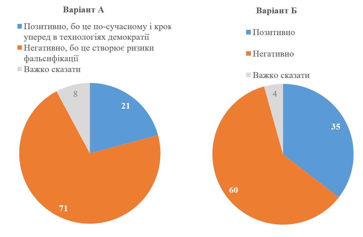 КМІС декілька разів ставив запитання про голосування онлайн, де пропонував обрати між двома твердженнями (варіант А нижче)[1]. Ці твердження відображали реалії періоду до повномасштабного вторгнення, хоча зараз контекст обговорення дещо інший. Тому для продовження динаміки ми половині респондентів ставили запитання в такому ж формулюванні (варіант А), а другій половині – в іншому формулюванні, де просто запитували, чи вони позитивно / негативно ставляться до голосування онлайн (варіант Б). Як можна бачити, якщо просто запитувати (без додаткової інформації) 60% негативно ставляться до ідеї голосування онлайн і лише 35% – позитивно. Якщо ж давати додаткові пояснення, то 71% обирають варіант із критичним ставленням до голосування онлайн, оскільки це створює ризики фальсифікацій. І натомість лише 21% обирають варіант, що це є кроком уперед в технологіях демократії. Причому в 2023 році на аналогічне запитання 69% відповіли, що вони негативно ставляться через ризик фальсифікацій (проти 29%, які мали позитивне ставлення). Тобто за останні декілька років суттєвих змін не відбулося. Таким чином, у будь-якому випадку голосування онлайн неприхильно сприймається населенням, а в разі обговорення можливих фальсифікацій – ставлення ще більше погіршується.