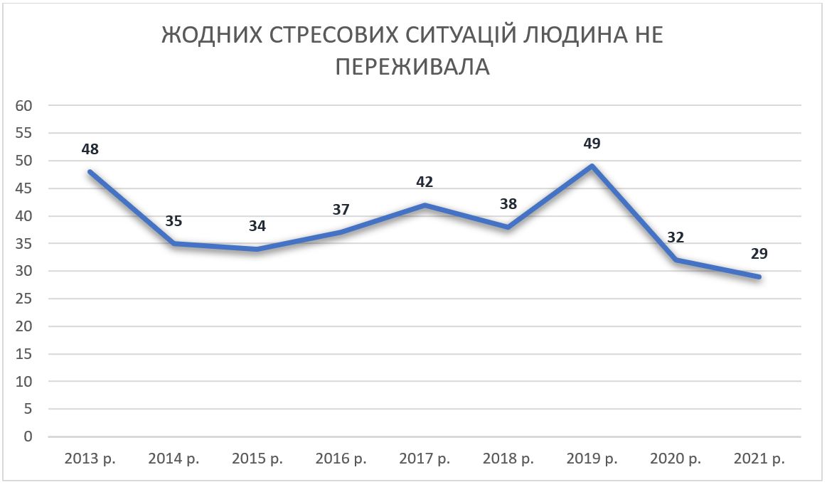 Лише 29% опитаних не переживали жодної стресової ситуації протягом 2021 року, що значно менше порівняно з 2019 роком, до пандемії (49%). Відносно 2020 року (32%) показник знизився на 3 відсоткових пункти, але ця різниця статистично незначуща. Схоже, що за останні два роки пандемія COVID-19 суттєво вплинула на життя українців і певною мірою виснажила громадян: у 2020-2021 році відбулося значне зростання частки тих, хто пережив важку хворобу або смерть близьких, втратив роботу.