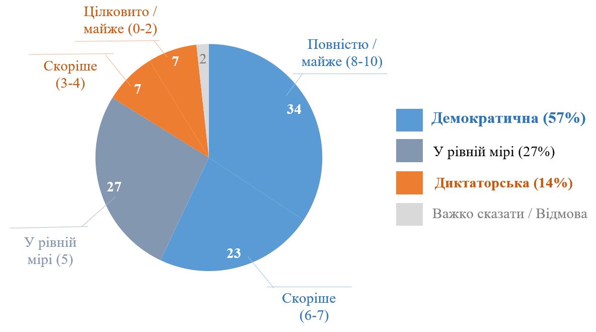 У лютому 2024 року ми попросили респондентів оцінити рівень демократичності України за шкалою від 0 до 10, де 0 означав, що Україна є цілковитою диктатурою, а 10 – що Україна є повністю демократичною (відповідь 5 означала, що Україна в рівній мірі є демократичною та авторитарною). Більшість українців – 57% – вважають, що Україна скоріше або повністю є демократичною (з них 34% вважають, що майже або повністю, а 23% вважають скоріше демократичною). Натомість лише 14% відповіли, що Україна є скоріше або цілковито диктаторською. Утім, ще є 27% респондентів, які вважають, що Україна водночас є в рівній мірі диктаторською і демократичною країною.