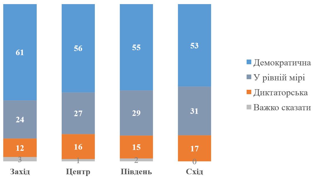 На графіку нижче дані наведені в регіональному вимірі. Хоча із Заходу на Схід стає трохи менше тих, хто вважає Україну демократією, але фактично у всіх регіонах більшість дотримується думки, що Україна зберігає свою демократичність (і не більше 17% вважають Україну диктаторською країною).