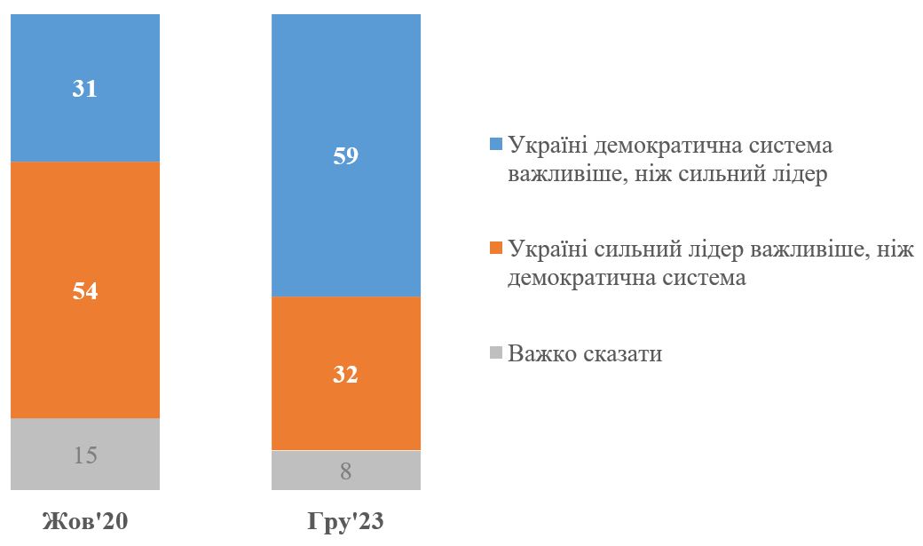 Інше питання – а що для самих громадян є важливіше: щоб ми мали сильного лідера (лідерів) чи щоб ми мали демократичну систему? У липні 2022 року на замовлення «Опори» КМІС ставив запитання, що «зараз» є важливим для України і 58% відповіли, що «зараз Україні сильний лідер важливіше, ніж демократична система», а про пріоритет демократичної система відповіли 27%[3]. Подібне запитання ми ставили у жовтні 2020 року, проте без акценту «зараз», тобто запитували, що в цілому має бути пріоритетом. На той момент 54% віддавали перевагу сильному лідеру і 31% – демократичній системі (що, відповідно, схожу на потреби «зараз» за опитуванням у липні 2022 року). Натомість у грудні 2023 року більшість українців (59%) відповіли, що Україні демократична система важливіша. Частка тих, хто вважав, що Україні важливіше мати сильного лідера – 32%.