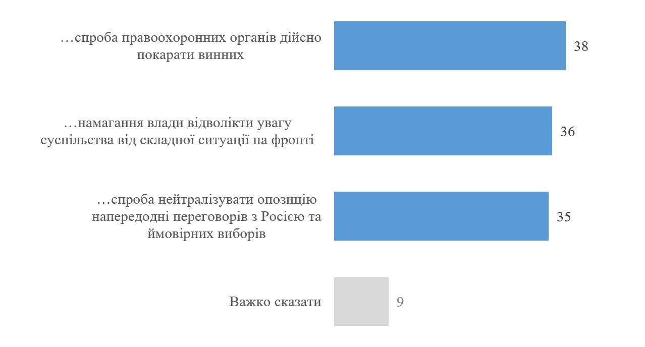12 лютого 2025 року РНБОУ ухвалила рішення «Про застосування персональних спеціальних економічних та інших обмежувальних заходів (санкцій)» і, зокрема, санкції були застосовані проти Петра Порошенка. КМІС в опитуванні, яке було проведене 14-24 лютого 2025 року ставив запитання, а як українці ставляться до цього. Респондентам ставилися три варіанти відповідей і респонденти могли обрати одну або декілька відповідей. Нижче на графіку наведені результати. Загалом, більшість респондентів – 59% – обрали або варіант «спроба відволікти увагу від складної ситуації на фронті» (серед усіх респондентів 36% обрали його), або варіант «спроба нейтралізувати опозицію напередодні переговорів з Росією та ймовірних виборів» (35% серед усіх респондентів)[1]. Водночас вважають, що ці санкції є спробою правоохоронних органів дійсно покарати винних – 38%. Решта 9% не змогли визначилися зі своєю думкою.