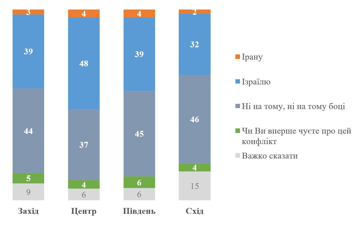 На графіку нижче результати наведені в розрізі регіону проживання[4]. У всіх регіонах більше тих, хто підтримує Ізраїль і мінімальна кількість симпатизують Ірану. Водночас найбільша підтримка Ізраїлю – у Центрі України.