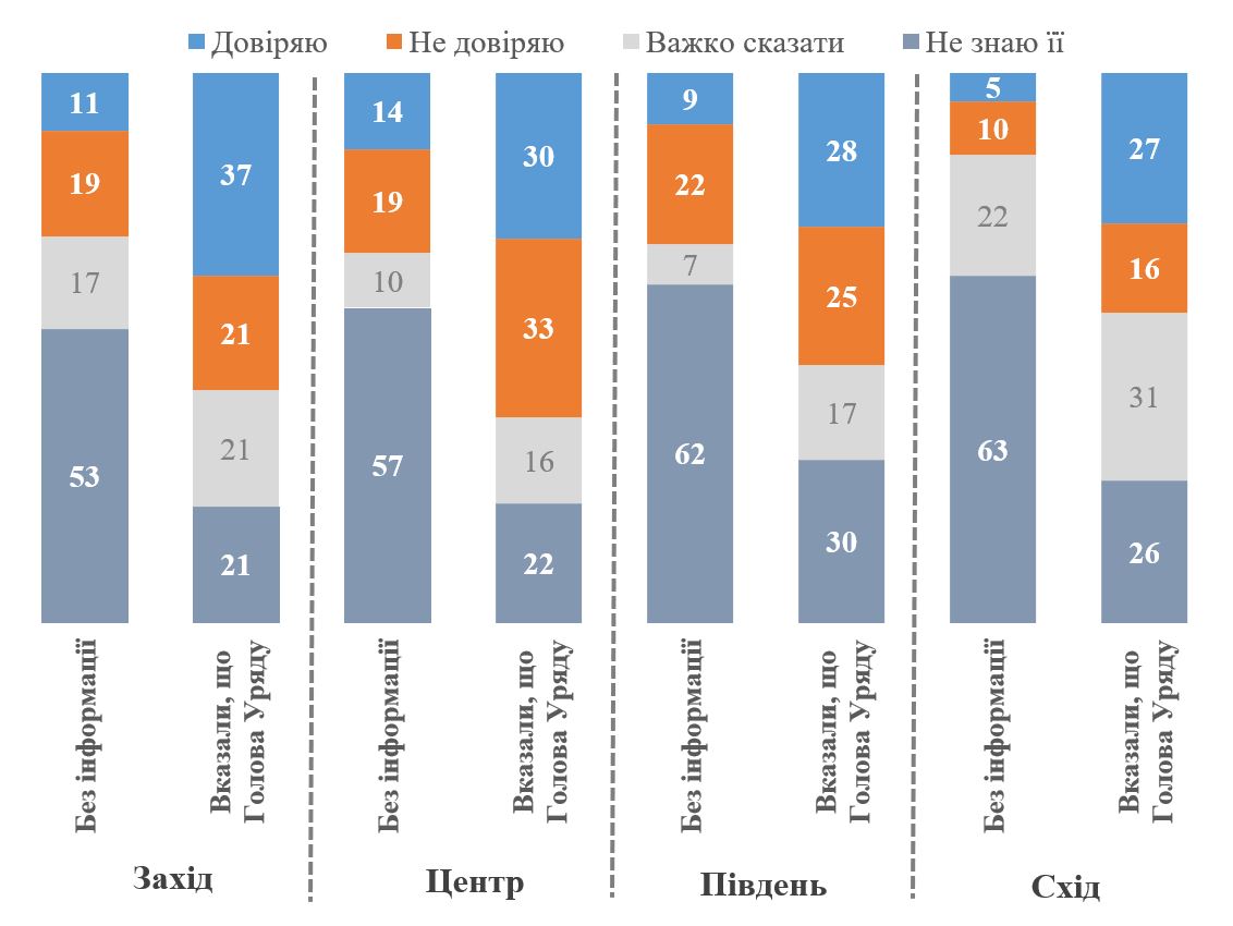 Нижче на графіку дані наведені у регіональному розрізі[1]. У всіх регіонах простежується тенденція, що не більше половини знають Ю. Свириденко, якщо не вказувати її нову посаду (а серед тих, хто знає, частіше респонденти говорили, що не довіряють їй, ніж довіряють). При цьому доцільно звернути увагу на рівень довіри для випадку, коли ми зазначали, що вона є Прем’єр-міністеркою. Так, відносно найвища довіра – на Заході і Сході, де більше тих, хто їй довіряє, ніж не довіряє. У той же час у Центрі і на Півдні ми спостерігаємо приблизний паритет – приблизно однакова кількість (у межах похибки) довіряють і не довіряють їй.