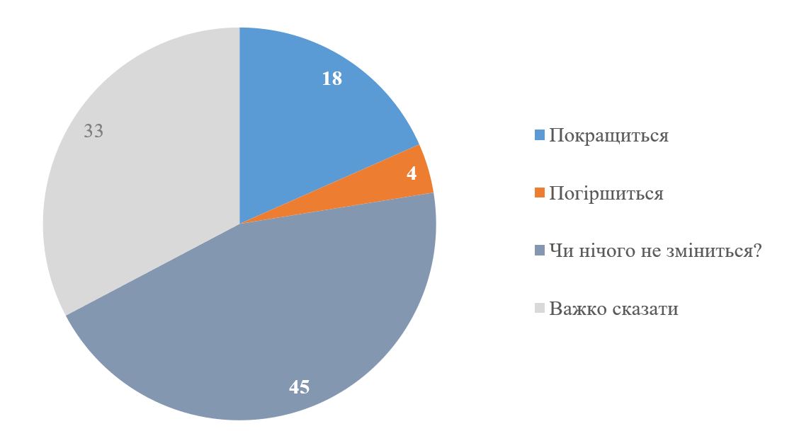 Близько половини респондентів (45%) вважають, що після призначення Ю. Свириденко Прем’єр-міністеркою діяльність Уряду не зміниться. Ще 33% не змогли сформулювати своїх очікувань. Таким чином, абсолютна більшість українців (78%) наразі не мають ані позитивних, ані негативних очікувань від Уряду Ю. Свириденко. Водночас мають позитивні очікування і вважать, що діяльність Уряду покращиться – 18%. Мають негативні очікування і вважають, що діяльність Уряду погіршиться – 4%.