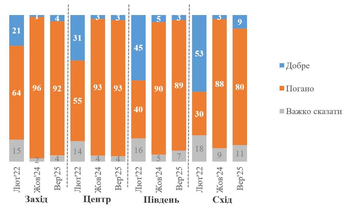 Нижче на графіку ми порівнюємо, як до Росії ставилися мешканці різних регіонів[1] у лютому 2022 року (напередодні вторгнення), у жовтні 2024 року (рік тому) і як ставляться зараз (у вересні 2025 року). Як можна бачити, абсолютна більшість населення у всіх регіонах – від 92% на Заході до 80% на Сході – погано ставляться до Росії. Частка тих, хто ставиться добре, варіює від лише 3-4% на Заході, у Центрі і на Півдні до 9% на Сході. Порівняно з 2024 роком на рівні тенденції можна бачити деяке покращення до Росії на Сході (з 3% до 9%). Проте треба враховувати, що вибірка респондентів на Сході невелика і ця різниця – у межах похибки.