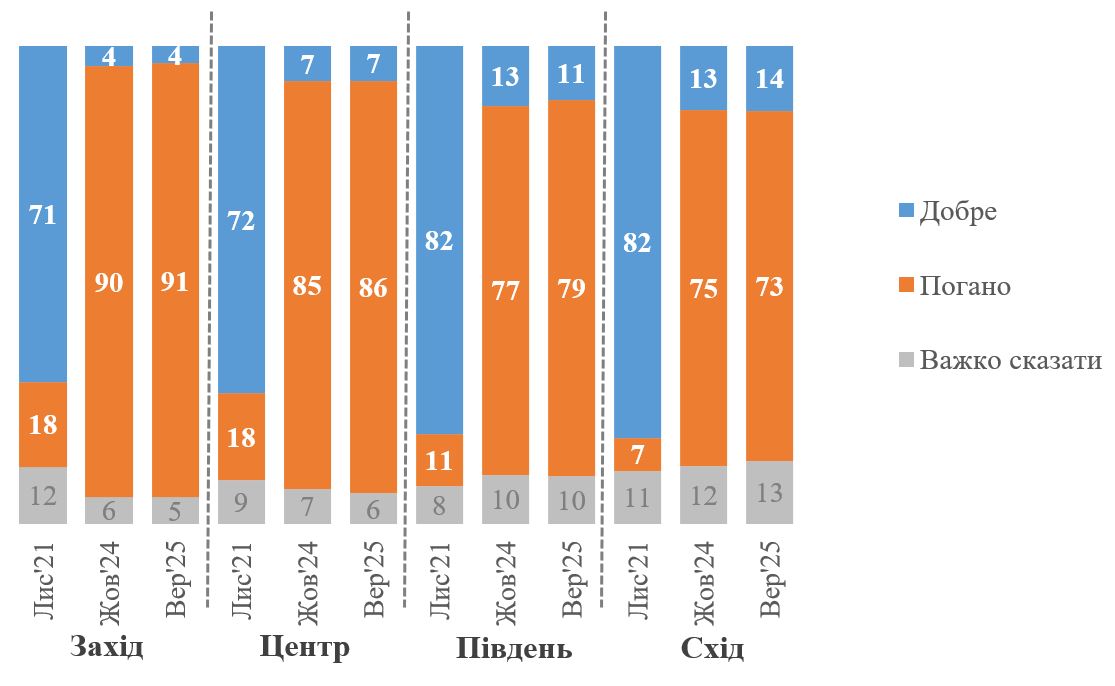 На графіку нижче порівнюються зміни між листопадом 2021 року і вереснем 2025 року. Станом на вересень 2025 року абсолютна більшість українців у всіх регіонах – від 91% на Заході до 73% на Сході – погано ставляться до росіян-мешканців Росії. Частка тих, хто продовжує добре ставитися до них, не перевищує 14% (на Сході).