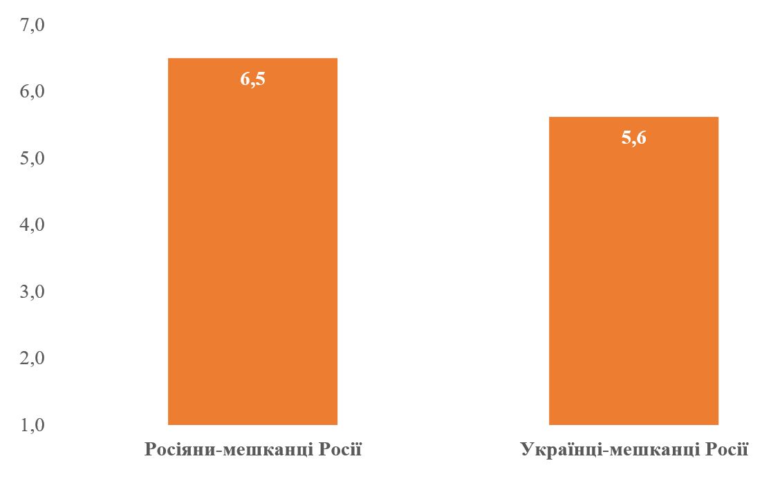 У вересні-жовтні 2024 року КМІС проводив експеримент, який показав, що ставлення до російськомовних етнічних росіян-мешканців України прохолодніше (або, скоріше, до них висуваються більш строгі вимоги «довести» свою ідентичність). Проте водночас якщо вони є патріотами України, то більшість українців усе-таки вважають їх належними до української нації[2]. Тобто за умови власної ідентифікації та дій на благо України, російськомовні росіяни є цілком легітимною частиною української нації. Тому коли українці висловлюють свою критичну думку про росіян-мешканців Росії, то скоріше мова йде про «політичне» визначення росіян, а не етнічне. Так, ми дізнавалися, як українці в Україні ставляться до українців-мешканців Росії. Як можна бачити на графіку нижче, хоча ставлення до українців у Росії трохи краще (ніж до росіян), але також виразно негативне – значення індексу 5.6 (а 49% респондентів відповіли, що українців в Росії взагалі не варто пускати в Україну). Тобто для українців в Україні навіть етнічні українці в Росії є ворогами, оскільки, скоріше за все, сприймаються як частина «русского мира», який є ширшим політичним поняттям, ніж більш вузьке визначення «етнічних росіян».