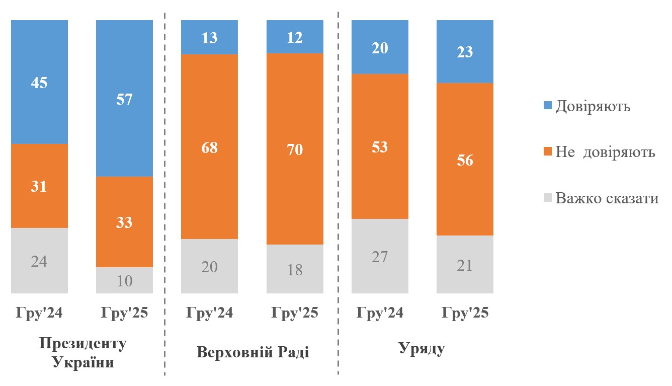 Один з найбільш важливих, маркерних показників стану суспільства та громадської думки – рівень довіри окремим інституціям. Раніше ми публікували результати опитування про довіру В. Зеленському[1], а в цій публікації ми хочемо показати довіру і іншим інституціям. Водночас у цій публікації результати щодо довіри Президенту (і, зокрема, в динаміці порівняно з груднем 2024 року) розраховані за іншими запитанням. Так, у нашій попередній публікації (згаданій раніше) ми запитували про довіру В. Зеленському і серед варіантів відповідей не пропонували «важко сказати» (хоча якщо респондент сам наполягав, ця відповідь відмічалася). У цій публікації представлені результати щодо довіри інституціям за запитанням, яке ми ставимо багато років у кінці року. Так, КМІС ставить запитання «Зараз я назву ще деякі соціальні інституції. Скажіть мені, будь ласка, наскільки Ви довіряєте тим, кого я називатиму – Ви цілком довіряєте, скоріше довіряєте, важко сказати напевно, довіряєте чи ні, скоріше не довіряєте чи зовсім не довіряєте?». Тобто респондент одразу серед можливих опцій чув і знав, що може обрати варіант «важко сказати». І ми запитували про довіру Президенту України (а не «В. Зеленському»). На графіку 1 наводиться динаміка довіра до органів державної влади: Президента, Верховної Ради, Уряду. На графіку 2 наводиться довіра до силових і правоохоронних інституцій: ЗСУ, СБУ, Національній поліції, НАБУ, прокурорам і судам. Насамкінець на графіку 3 наводиться довіра інституціям громадянського суспільства: Церкві, українським ЗМІ і волонтерам. На кожному графіку ми порівнюємо поточні результати з результатами на кінець 2024 року для оцінки динаміки за останній рік (крім НАБУ, оскільки ми про НАБУ ми запитували вперше). Водночас у Додатку можна знайти результати в динаміці за 2021-2025 роки. Також у Додатку наведені дані про довіру до інституцій у регіональному вимірі. Отже, якщо в грудні 2024 року за таким формулюванням запитання 45% довіряли Президенту, то в грудні 2025 року – 57%. Водночас показник недовіри майже не змінився – 31% у 2024 році і 33% у 2025 році. Баланс довіри-недовіри за рік зріс з +10% до +24%. Ріст довіри відбувся за рахунок зменшення частки тих, хто мав невизначене ставлення – з 24% до 10%. Наша попередня публікація показувала, що протягом 2025 року була значна динаміка в довірі Президенту. Скоріше за все, зниження частка тих, хто мав невизначене ставлення, і переважний перехід у довіру, пов’язаний із ефектом згуртування навколо прапора. Тобто в умовах викликів 2025 року багато хто з українців, які мали невизначене ставлення, почали говорити, що довіряють Президенту, щоб продемонструвати єдність у відстоюванні інтересів України. Проте як і раніше, іншим органам влади – парламенту і Уряду – більшість українців не довіряють і істотних змін за рік не відбулося. У випадку Верховної Ради 12% довіряють їй і 70% – не довіряють (у грудні 2024 року – 13% і 68%). Баланс довіри-недовіри становить -58% (у грудні 2024 року – -55%). При цьому більше половини українців можуть назвати принаймні одну фракцію, чию діяльність вони схвалюють, тобто висока недовіра парламенту не означає недовіри всім парламентарям[2]. Довіра Уряду трохи вища, проте також низька: зараз довіряють 23% (у грудні 2024 року – 20%), не довіряють – 56% (у грудні 2024 року – 53%). Баланс довіри за останній рік не змінився і становить ті самі 
