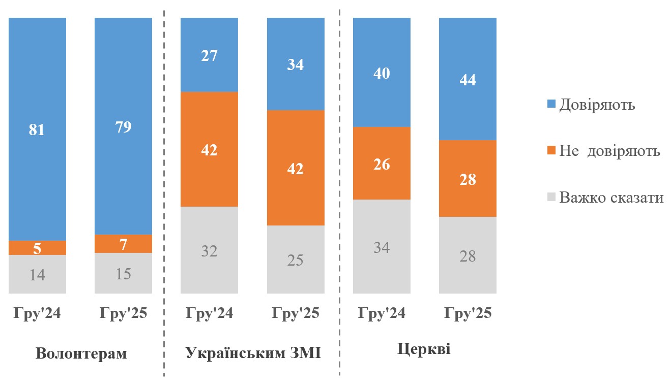 ![]() І наостанок довіри до інституцій серед громадянського суспільства. В Україні зберігається висока довіра волонтерам – 79% їм довіряють і лише 7% не довіряють (у грудні 2024 року показники були 81% і 5% відповідно). Довіра українським ЗМІ лишається доволі низькою, хоча за останній рік ситуація трохи покращилася. Так, зараз українським ЗМІ довіряють 34%, не довіряють – 42% (решта 25% мають невизначене ставлення). У грудні 2024 року довіряли 27%, не довіряли – 42%. Тому якщо торік баланс довіри-недовіри становив -15%, то зараз – -8%. Проте як можна бачити, рівень недовіри лишився на тому ж рівні, а довіра зросла за рахунок зниження частки тих, хто мав невизначене ставлення. Церква раніше була інституцією-лідером за довірою, проте за останні роки істотно втратила в довірі. За останній рік ситуацію з довірою Церкві трохи покращилася – зараз 44% довіряють Церкві і 28% не довіряють. У 2024 році співвідношення було 40% до 26%.
