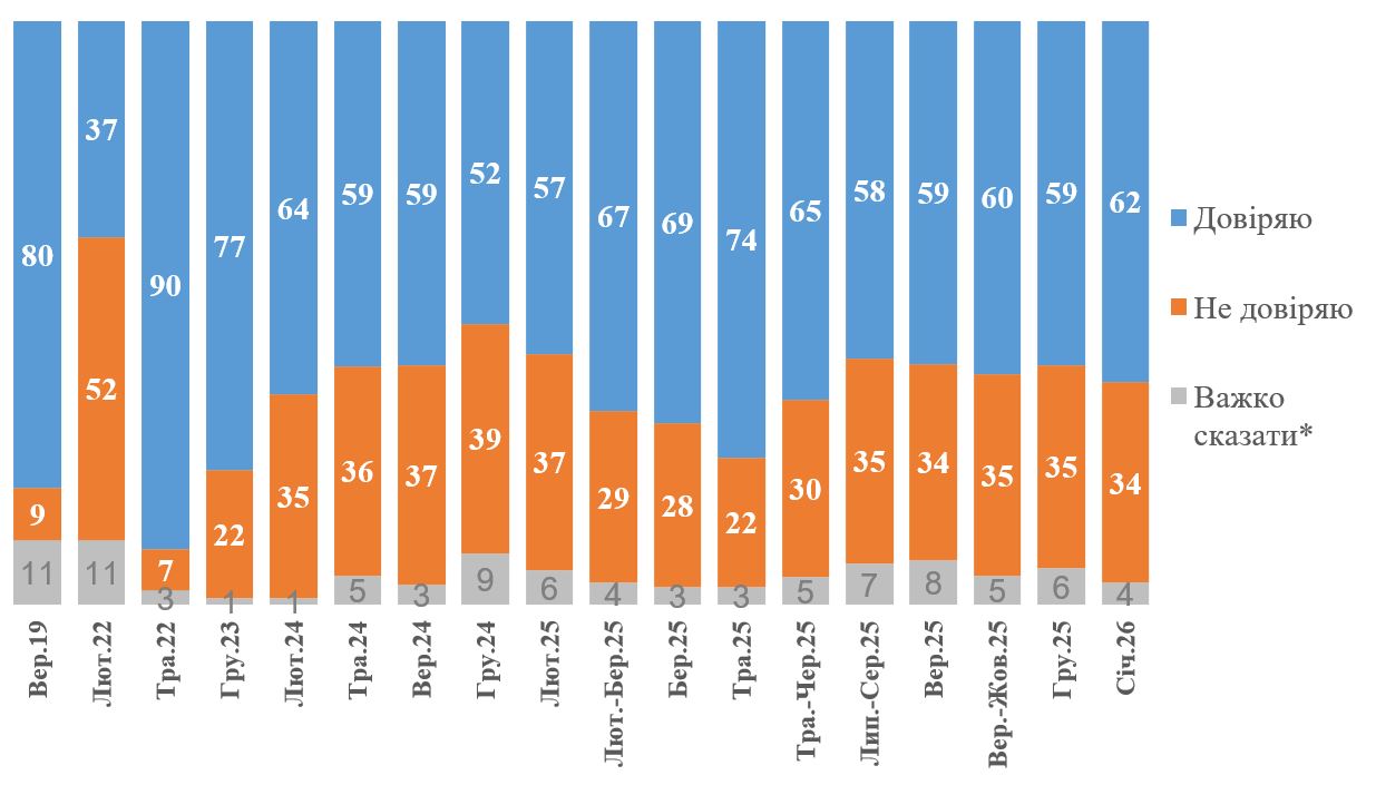 На графіку нижче наведена динаміка довіри В. Зеленському. Як можна бачити, порівняно з груднем 2025 року, тобто за останні декілька тижнів, суттєвих змін не відбулося.